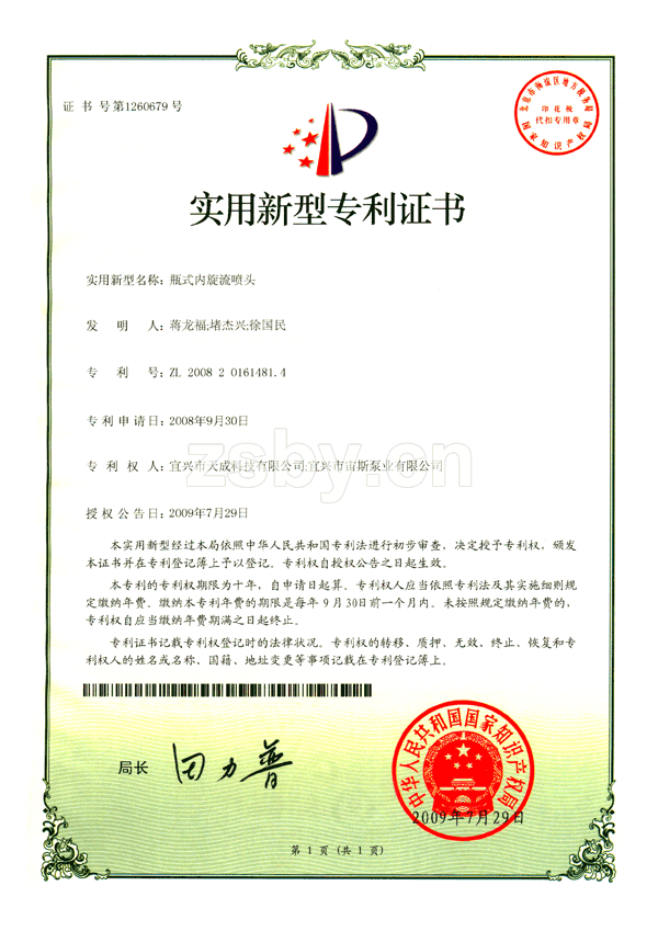 瓶式內(nèi)旋流噴頭(ZL200820161481.4)