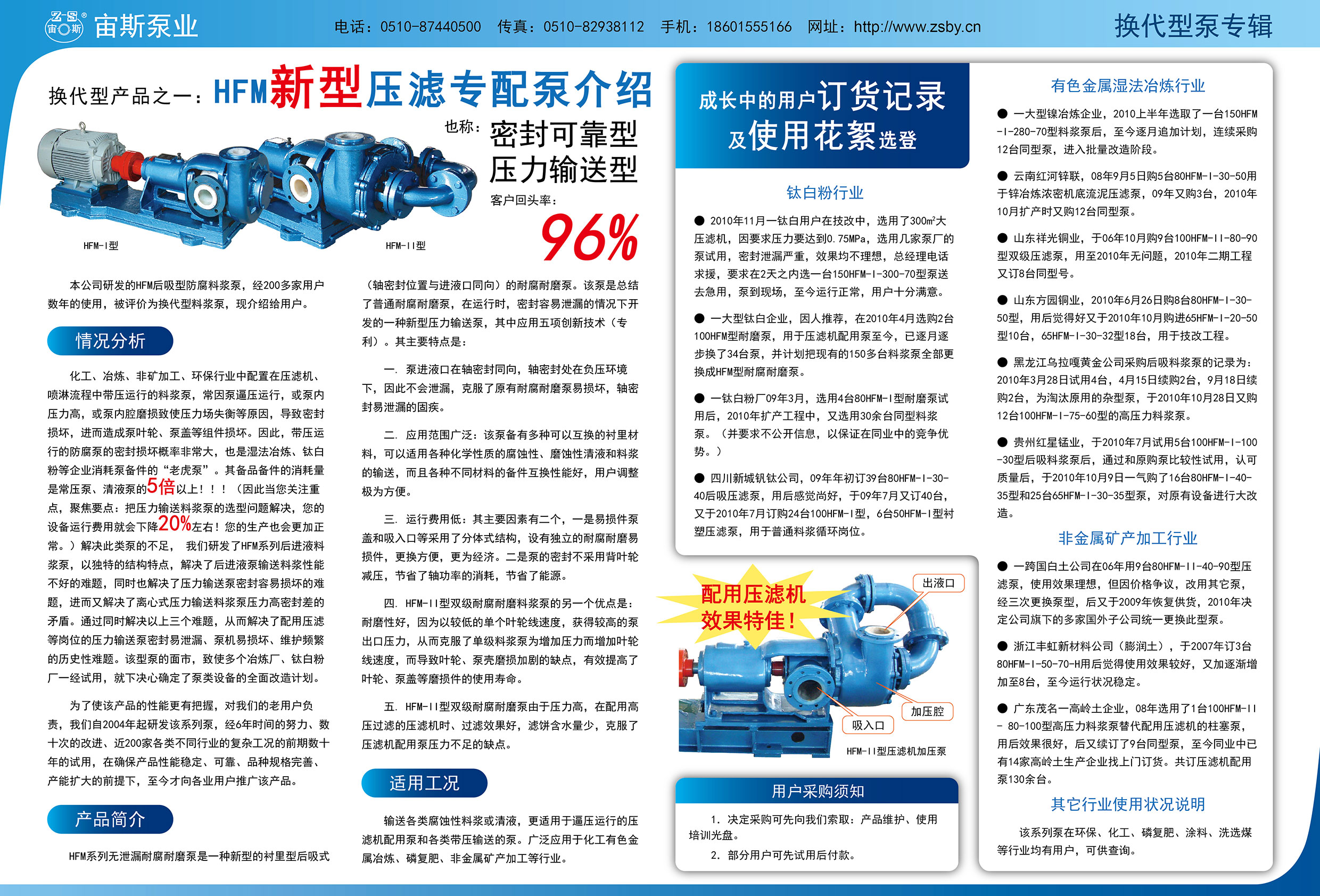 該宣傳資料印制于2011年年初,著重介紹了兩款換代型的新產(chǎn)品:HFM系列新型壓濾專配泵和UHB-UF系列塑料內(nèi)置鋼骨架泵。
