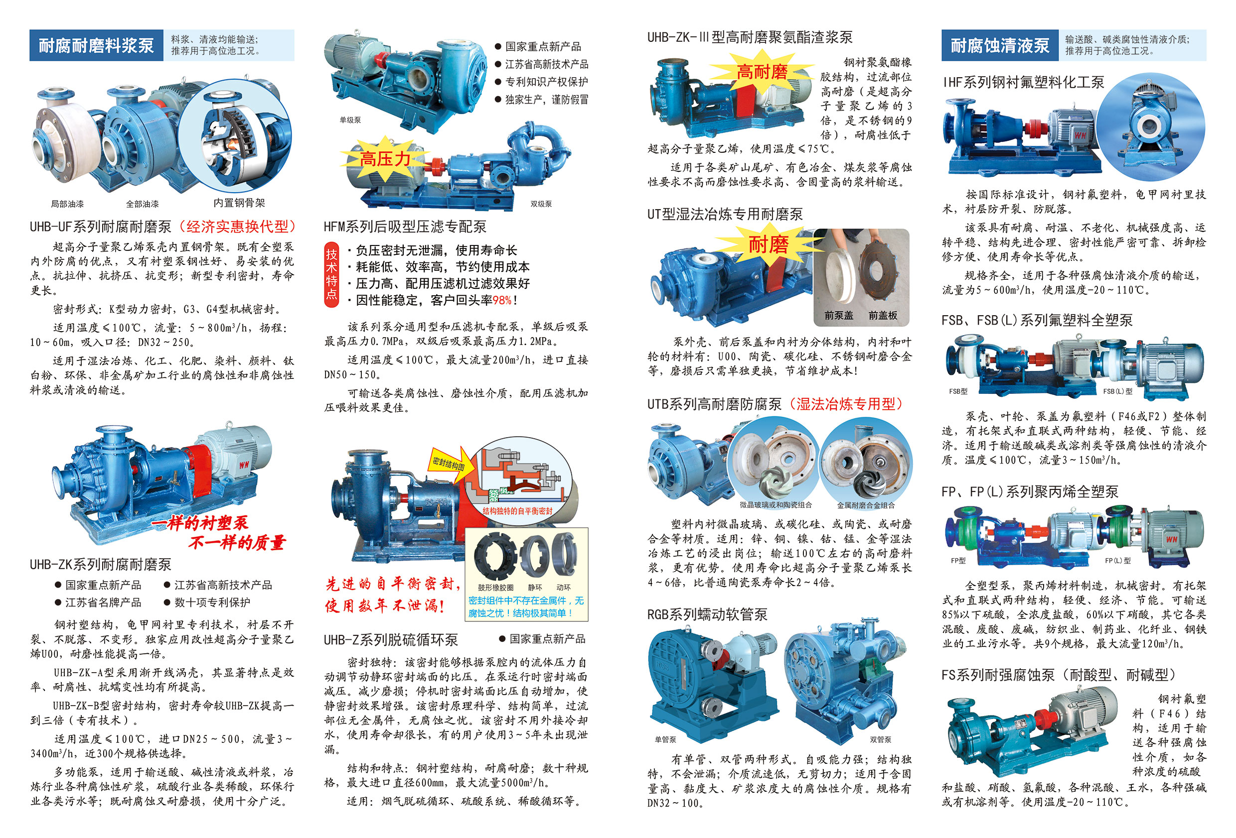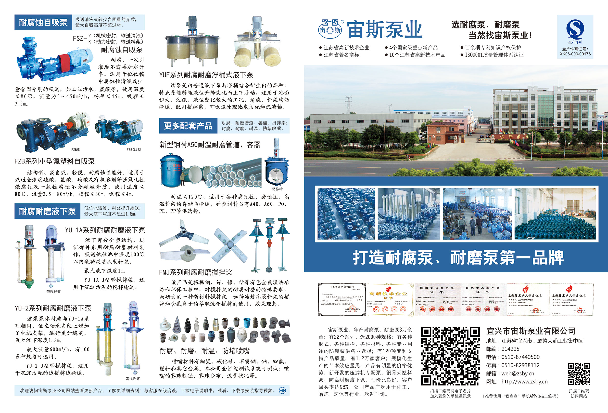 本宣傳頁編印于2014年2月,封面簡單展示了宙斯泵業(yè)形象,內容頁綜合介紹了宙斯泵業(yè)各類產品,包括:耐腐耐磨料漿泵、耐腐蝕清液泵、耐腐蝕自吸泵、耐腐耐磨液下泵以及管道、容器、攪拌槳、噴嘴等配套產品。