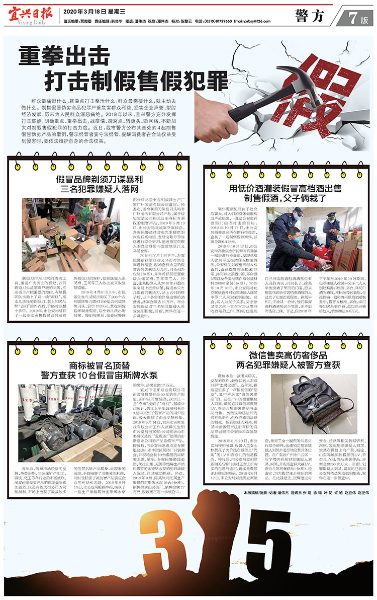 2020年3月18日,《宜興日報》警方專欄以“重拳出擊 打擊制假售假犯罪”為主題報道了宜興警方查處的4起制售假冒偽劣產(chǎn)品的案例,其中一則“商標(biāo)被冒名頂替 警方查獲10臺假冒宙斯牌水泵”,記載了宙斯泵業(yè)耐腐耐磨泵產(chǎn)品被仿冒的案件。全文如下: